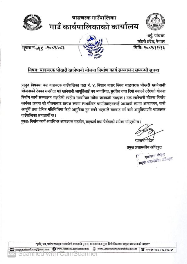 याङवरक पोखरी खानेपानी योजना निर्माण कार्य सञ्चालन सम्बन्धी सूचना